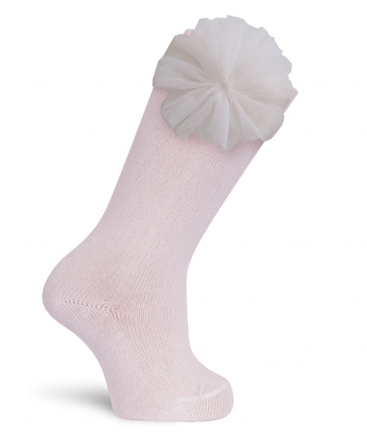 Calcetín alto algodón liso con rosetón de tul. Diferentes colores.