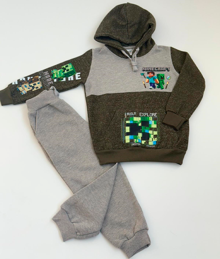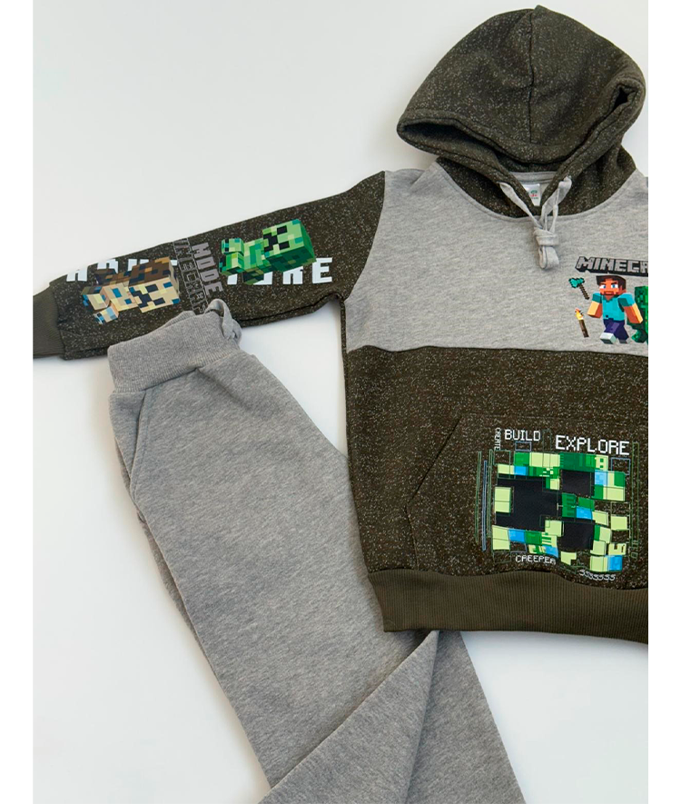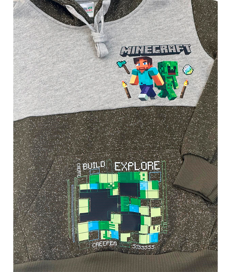 Chándal niño dos piezas Minecraft: - Sudadera con capucha en felpa cardada con cordón, bolsillo canguro y dtf en frente, bolsillo y manga de color verde y gris. - Pantalón de felpa cardado con bolsillos, cordón ajustable y puños de color de gris.