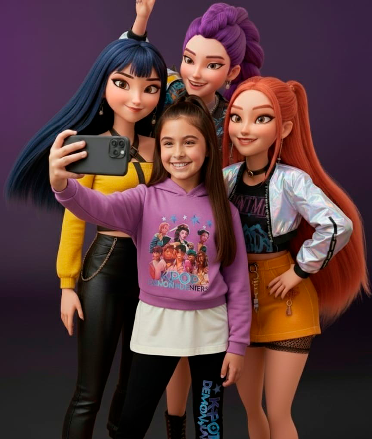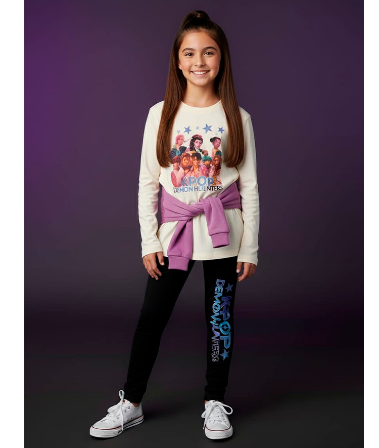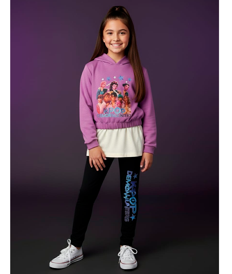 Conjunto niña de sudadera crop top en felpa cardada con capucha forrada en contraste, modelo oversize color lila. Camiseta algodón cardado con elastano color perla. Legins en felpa con licra cardada y mucha elasticidad color negro.