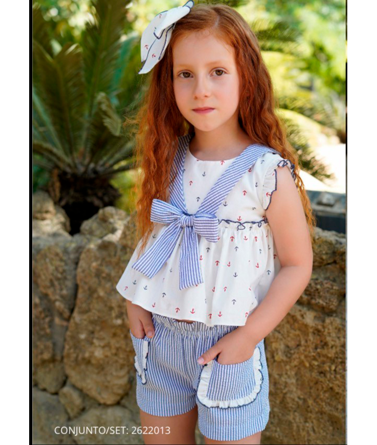Conjunto niña de blusa estampada ancla y pantalón corto de rayas.