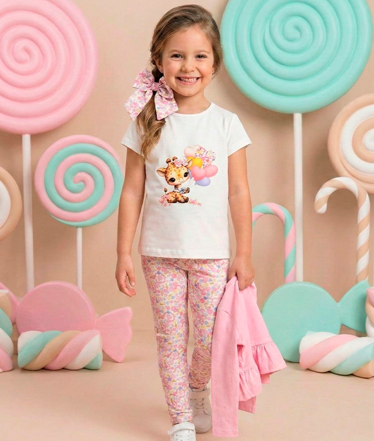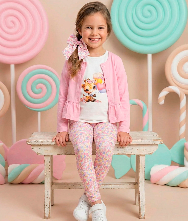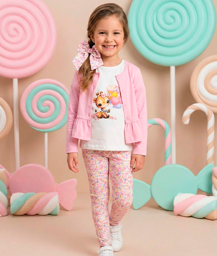 Conjunto niña 3 piezas formado por: - Chaqueta de algodón licra fina con volante y botones en color rosa. - Camiseta manga corta blanca de algodón con licra y aplicación con piedras de brillo - Leggins en algodón con licra sublimada de flores