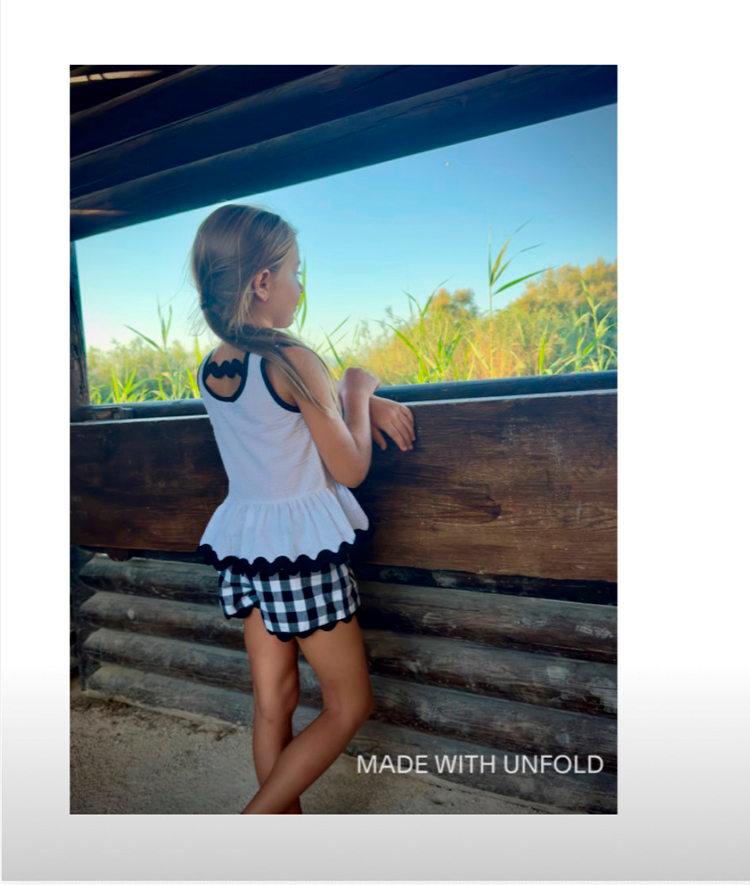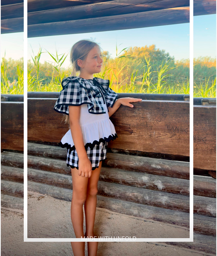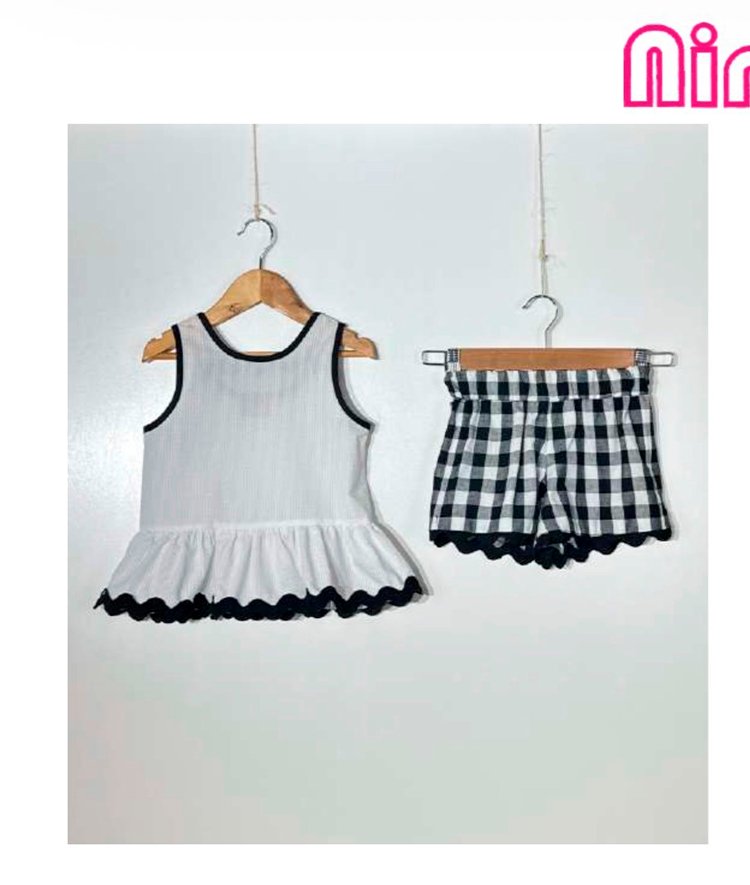 Conjunto niña de blusa blanca y pantalón corto vichy negro.