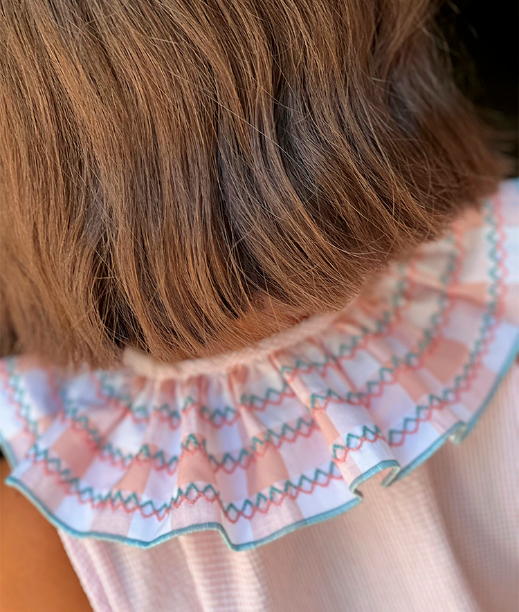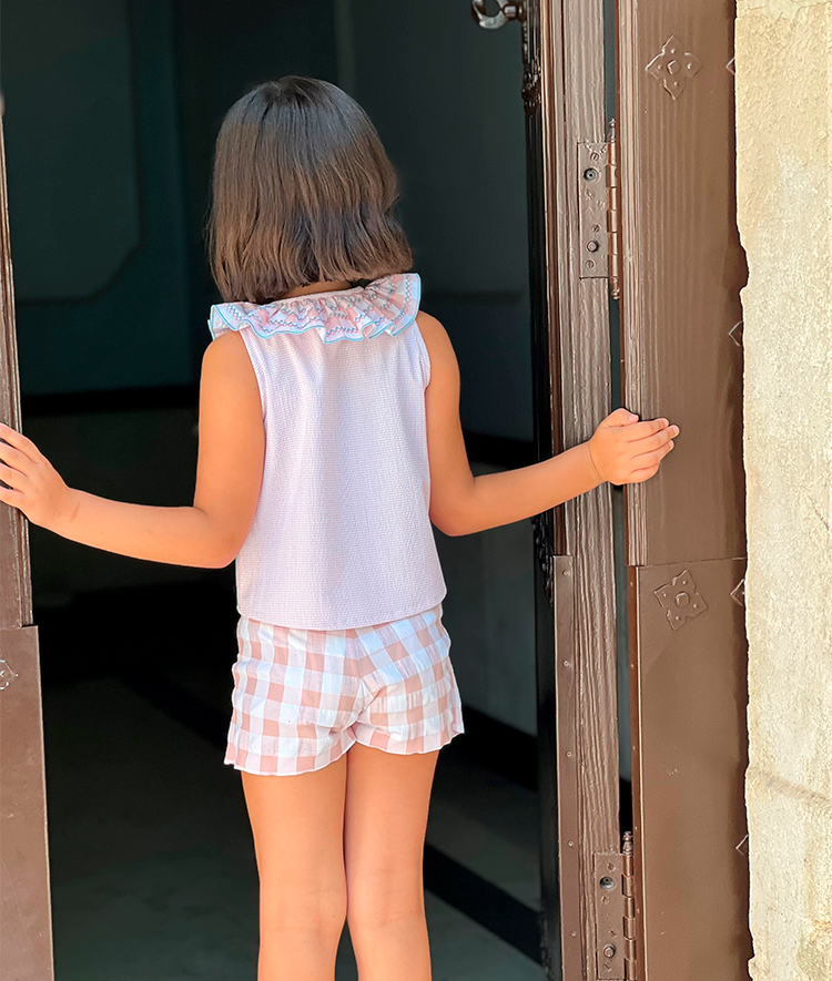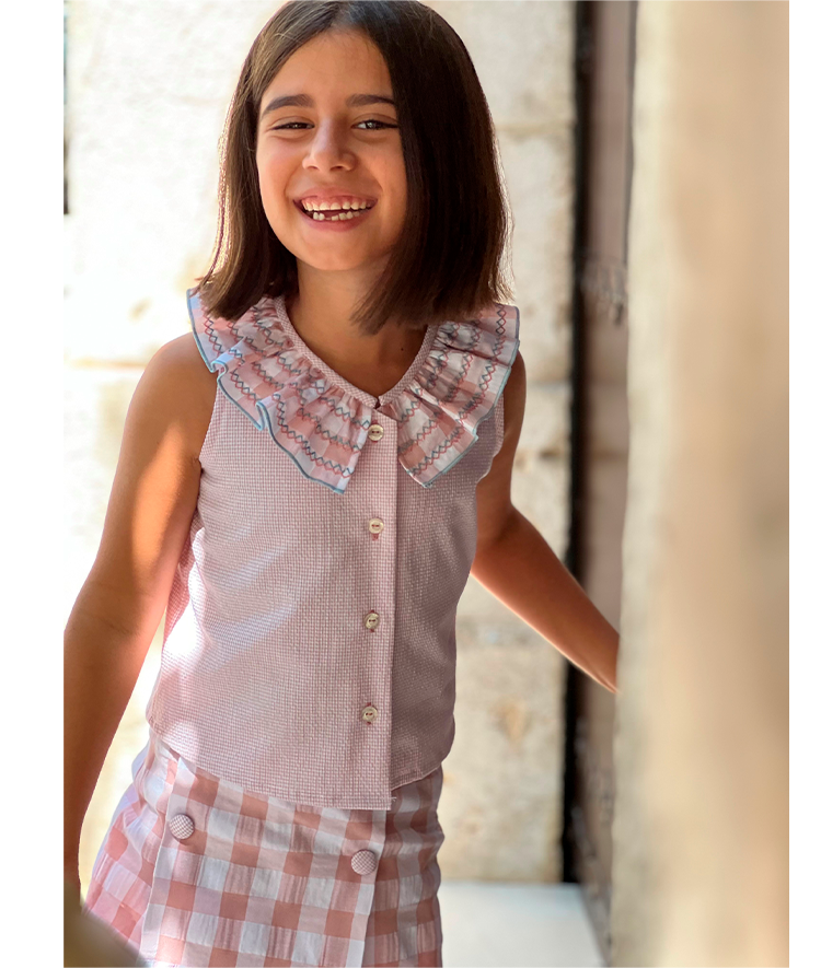 Conjunto niña de blusita y falda pantalón en diferentes tejidos de vichy rosa y ribetes en turquesa.