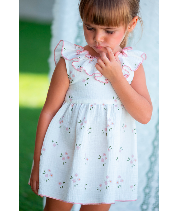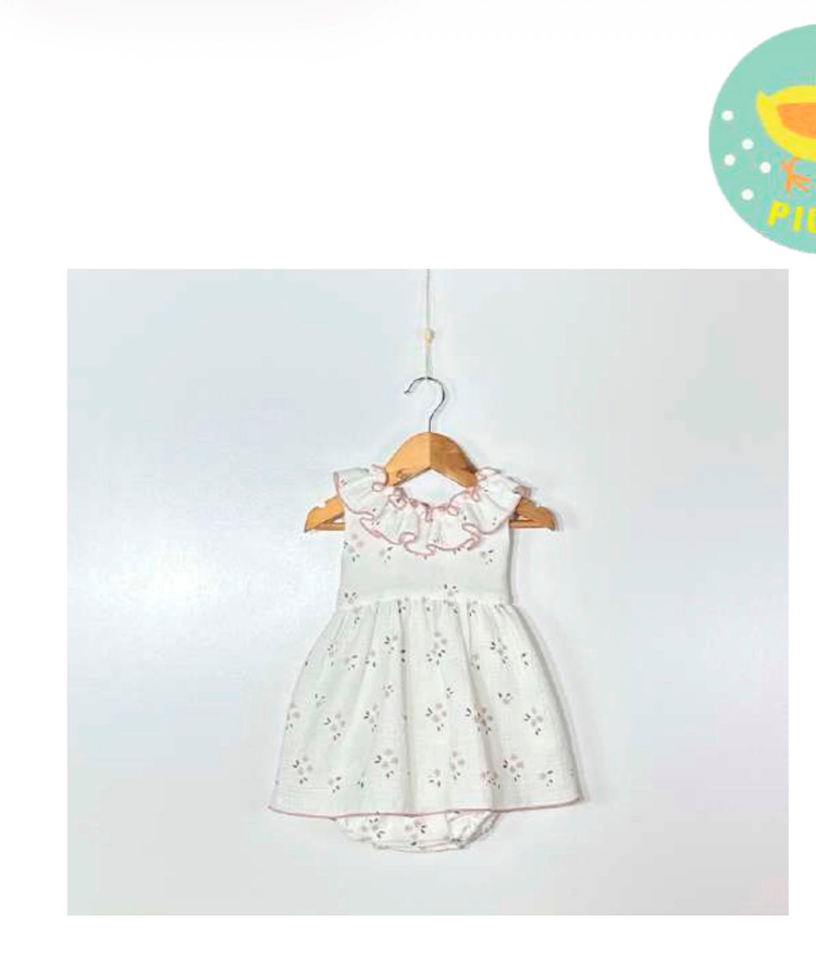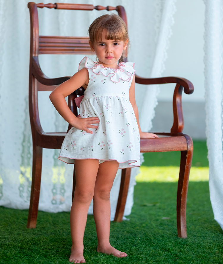 Jesusito bambula blanco con flores en rosa y braguita a juego.