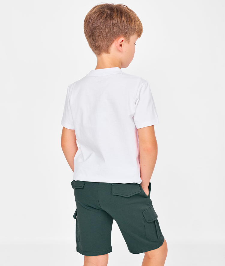 Set niño de camiseta de manga corta con bandera en parte delantera y bermuda cargo en color azul marino.