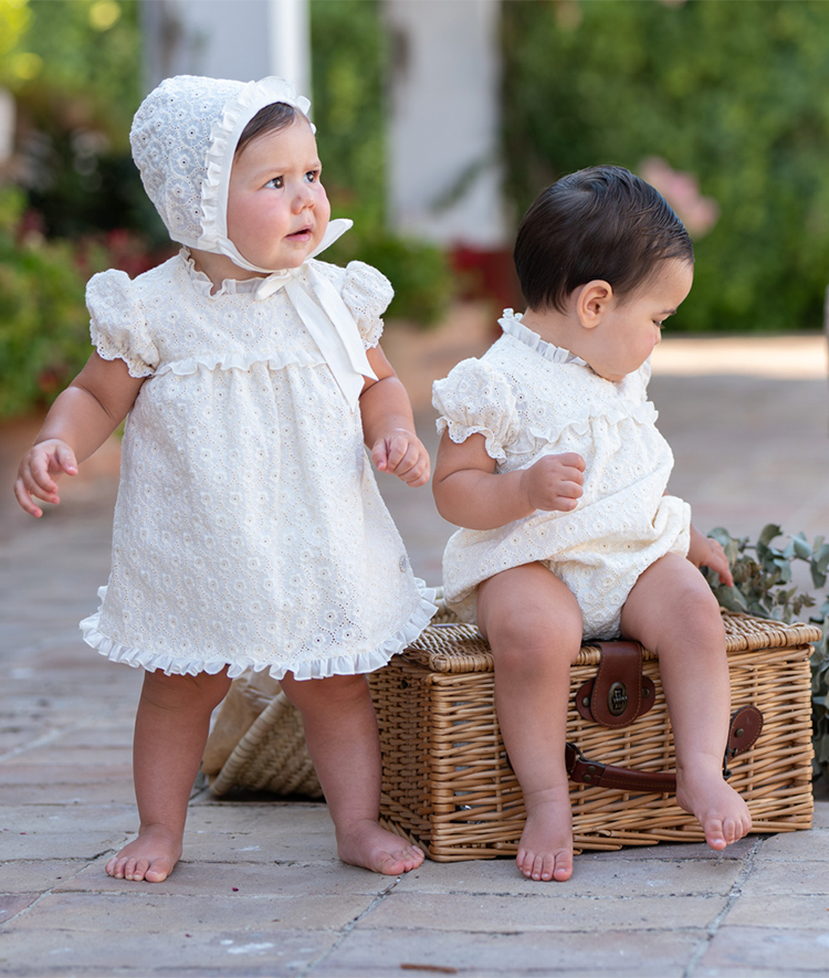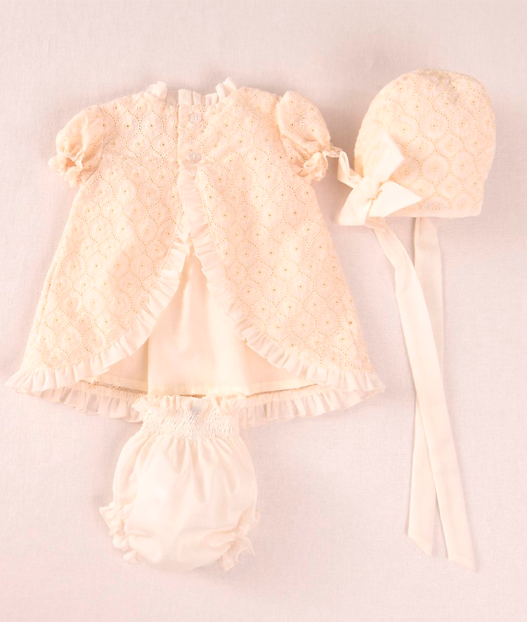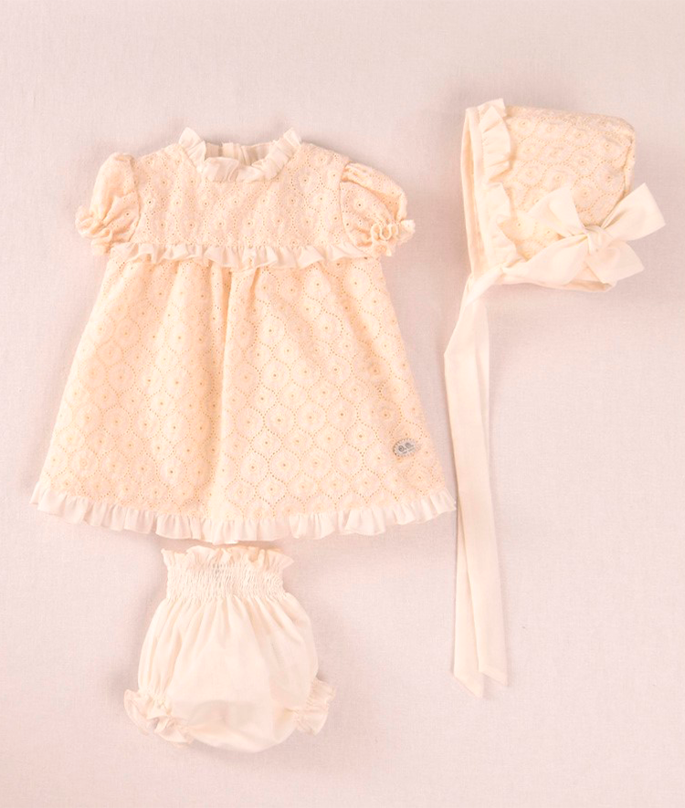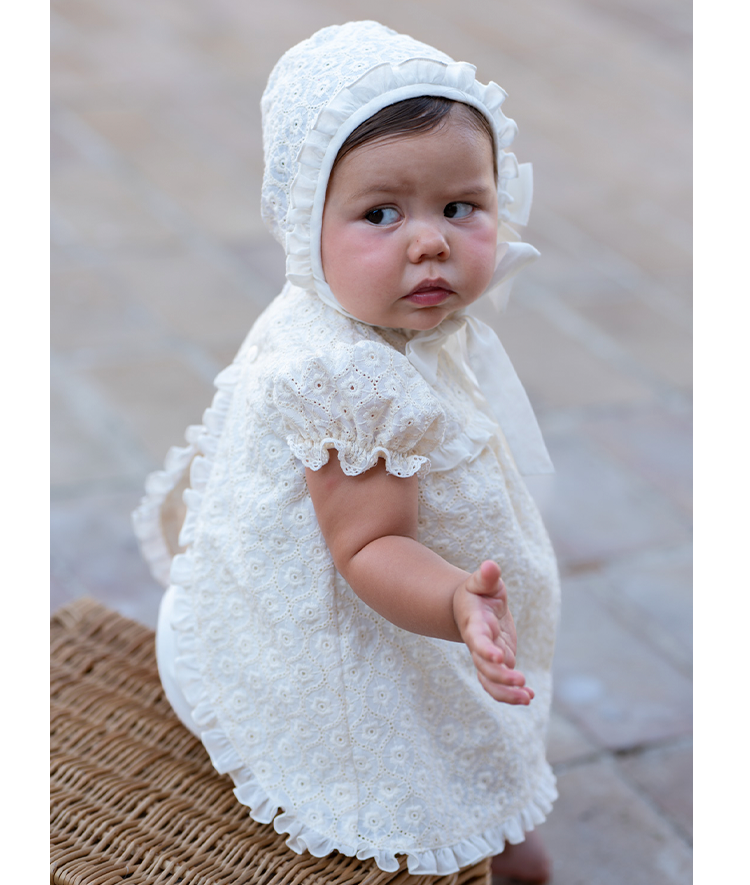 Vestido bordado bebe en color crudo con braguita y capota a juego.