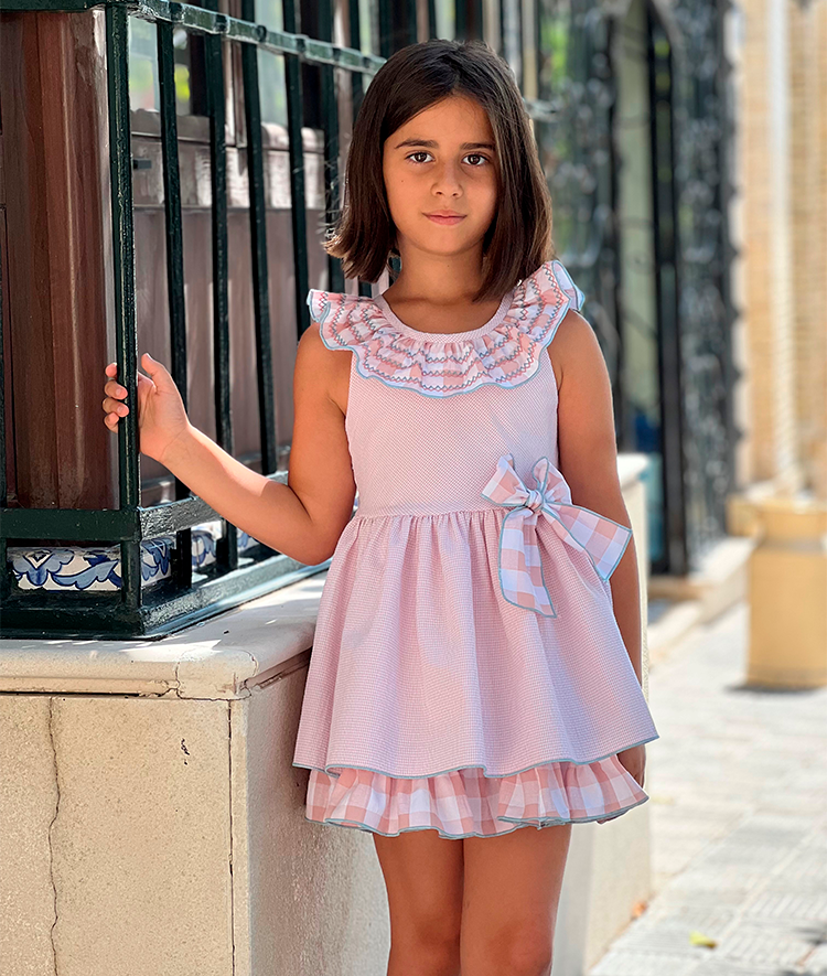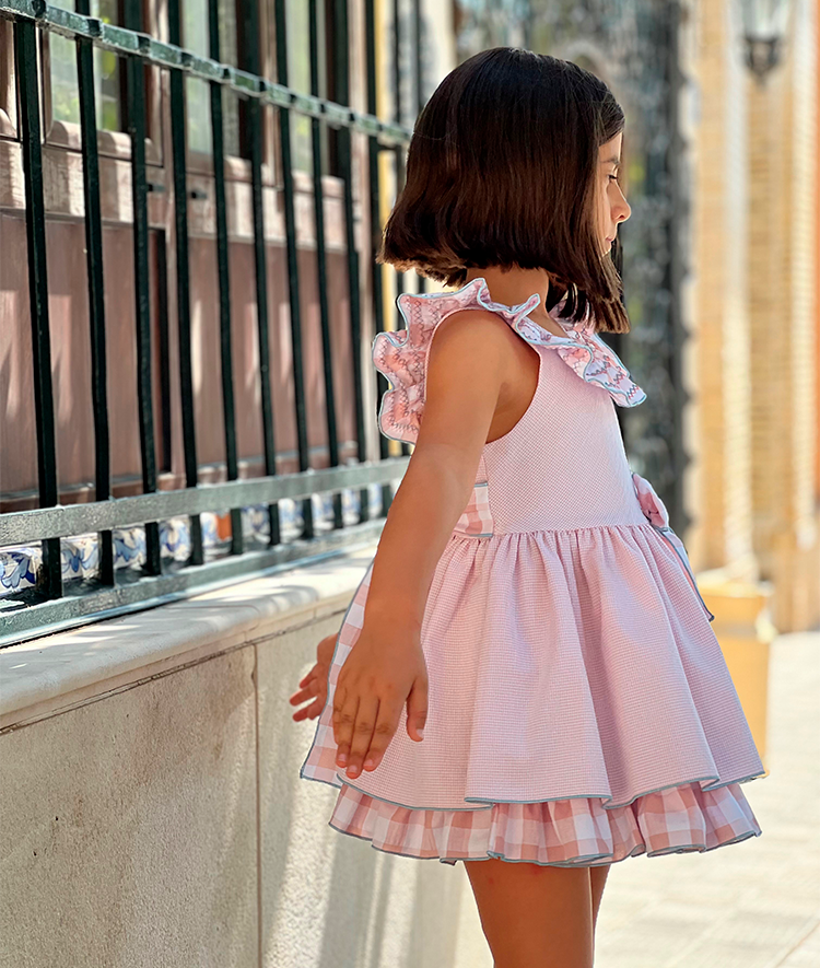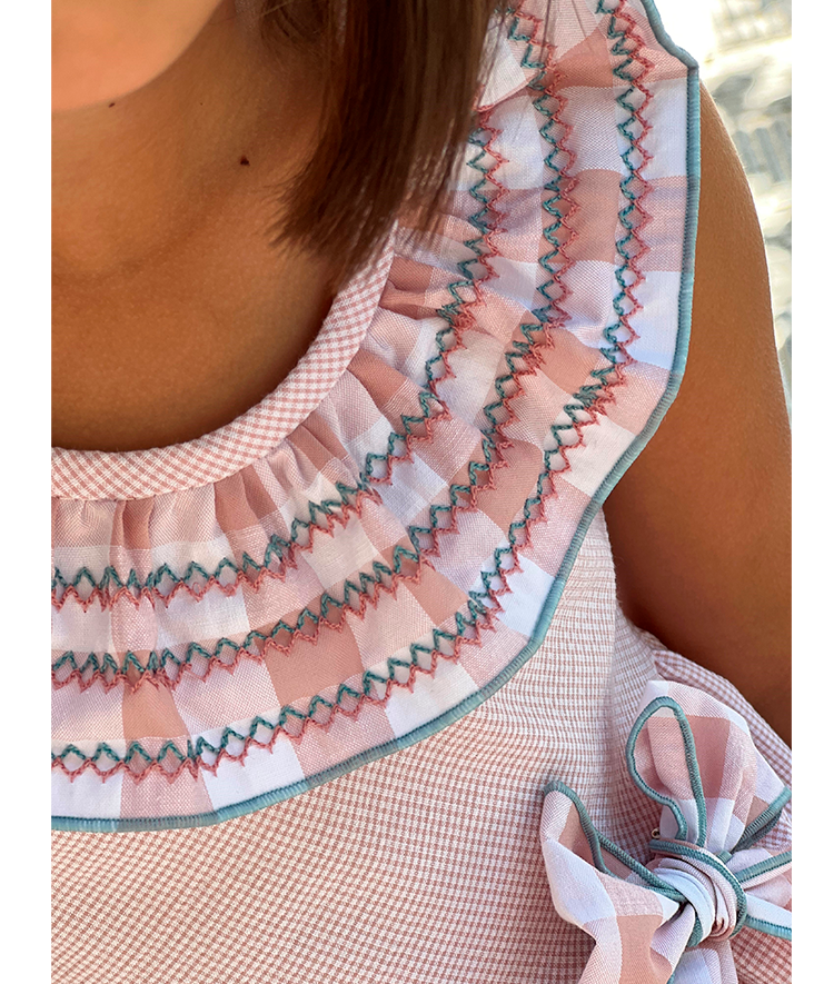 Vestido combinado de tejidos en vichy rosa y ribetes turquesa.