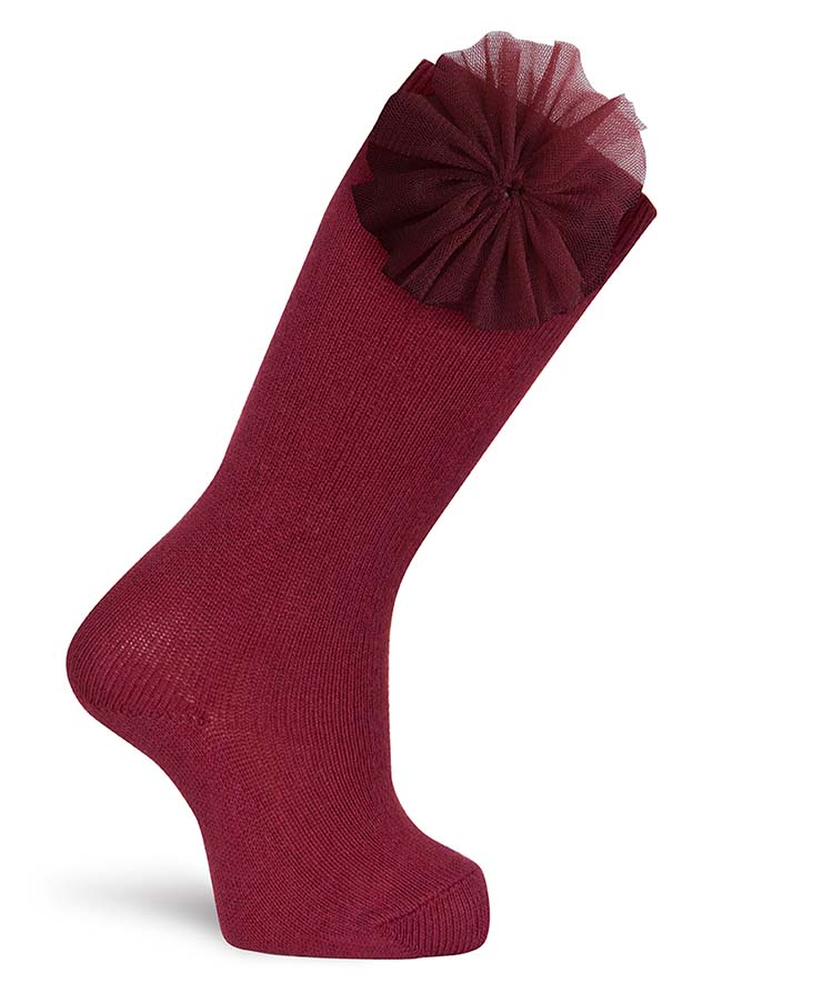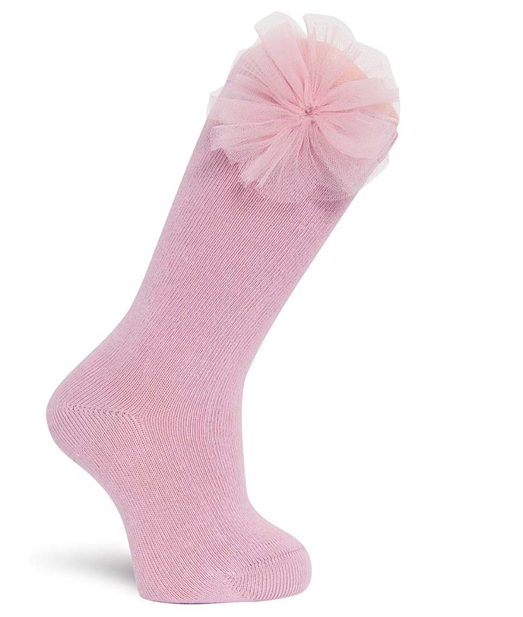 Calcetines altos lisos con rosetón de tul confeccionados en algodón. Diferentes colores