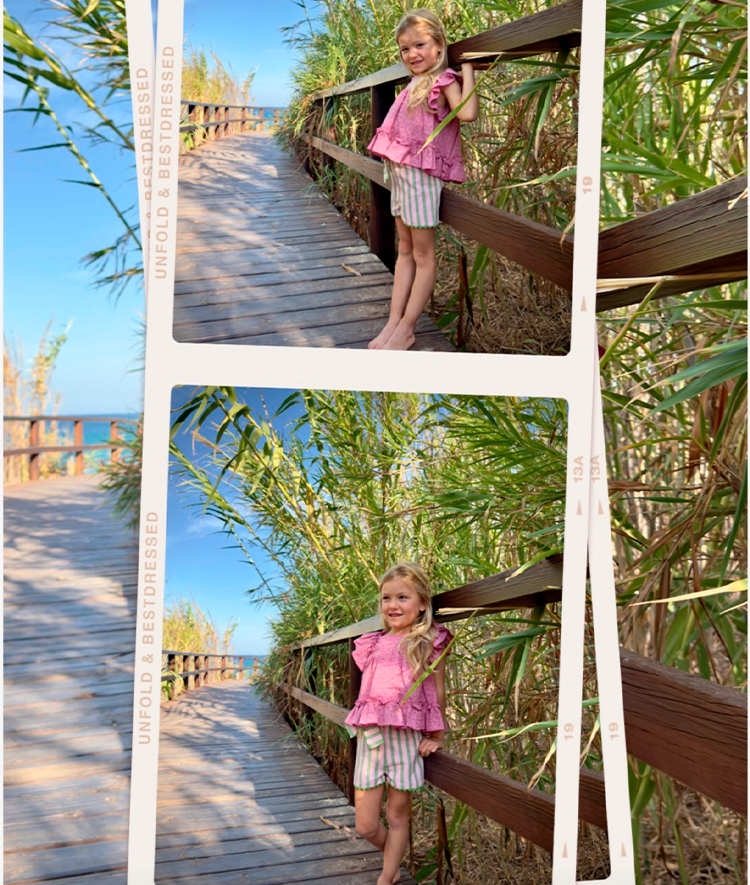 Conjunto de niña de camisa perforada y pantalon de rayas.