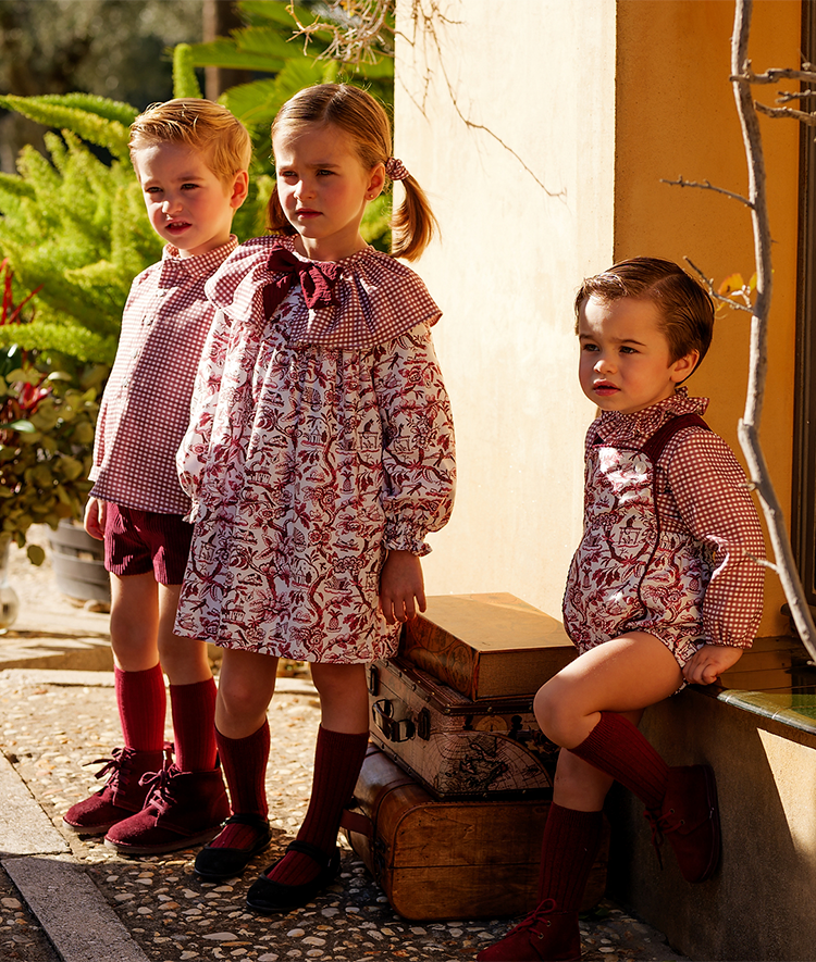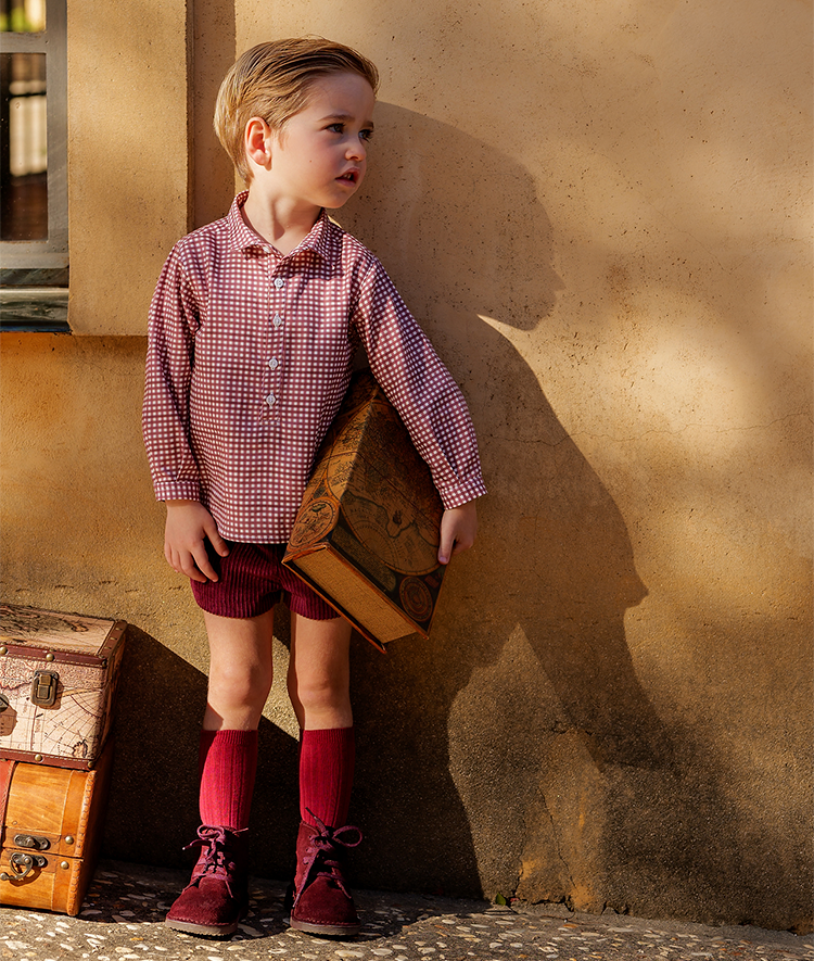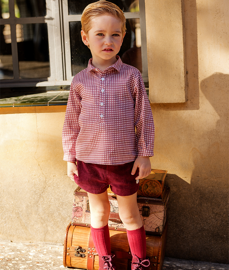 Conjunto niño dos piezas de camisa de manga larga y pantalón corto de pana, familia Toile de Jouy