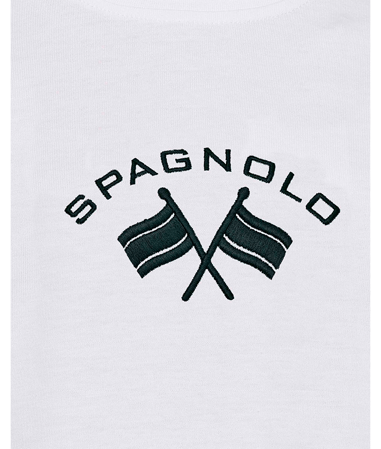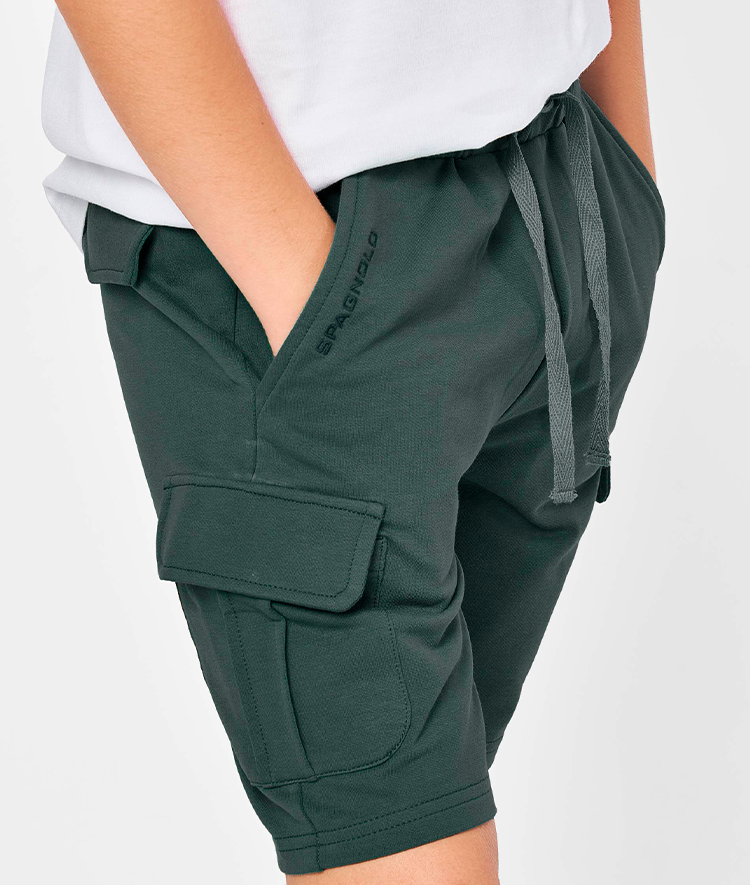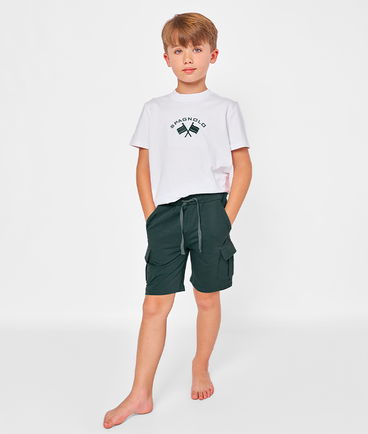 Set niño con camiseta de manga corta y bandera en parte delantera y bermuda cargo en color azul marino.