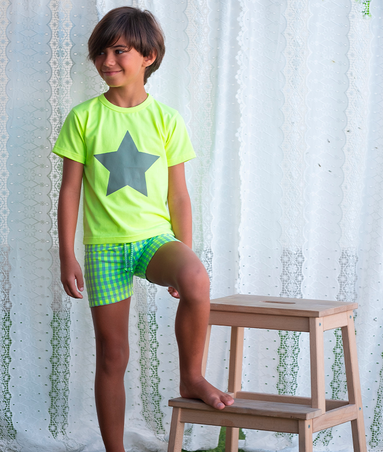 Bermuda niño vichy amarillo flúor combinada con gris.