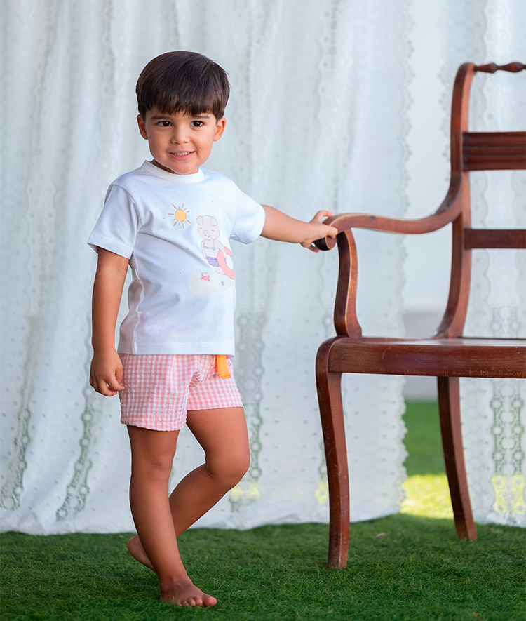 Conjunto de baño compuesto por camiseta de manga corta y boxer de licra familia caracola.