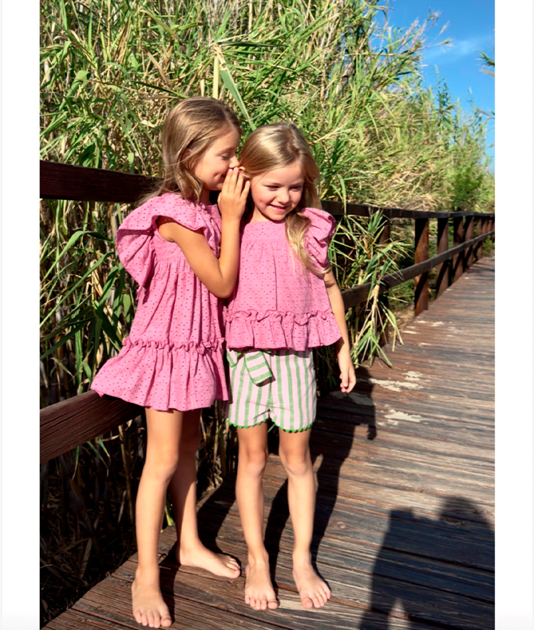 Conjunto de niña de camisa perforada y pantalon de rayas.