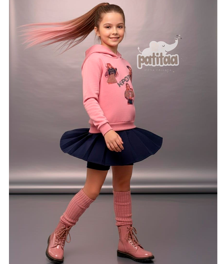 Conjunto de niña de sudadera color rosa en felpa cardada con estampado con brillos y falda con short incorporado en felpa cardada en color azul marino.