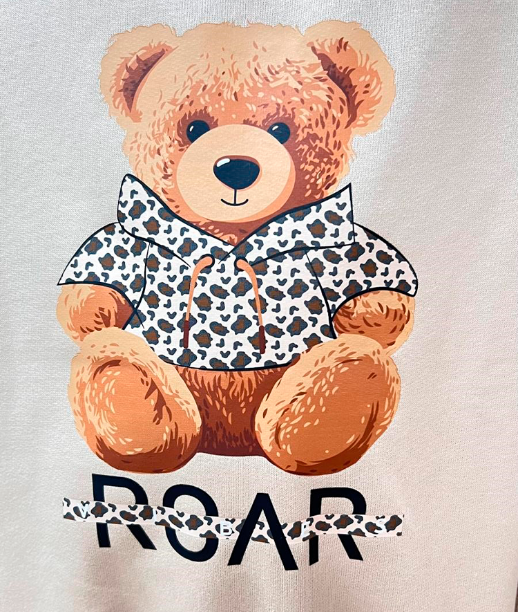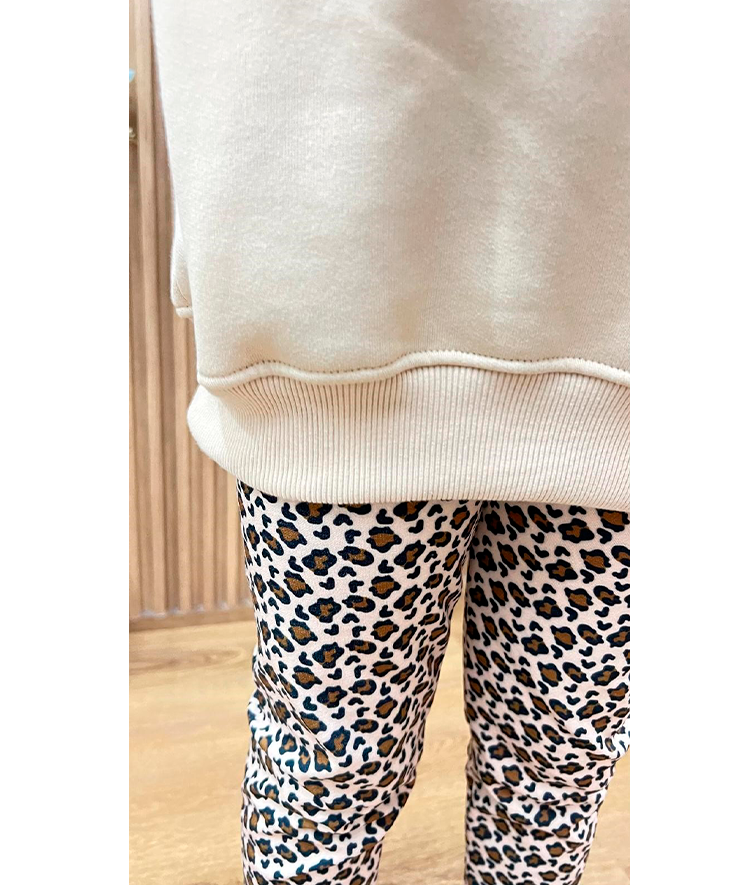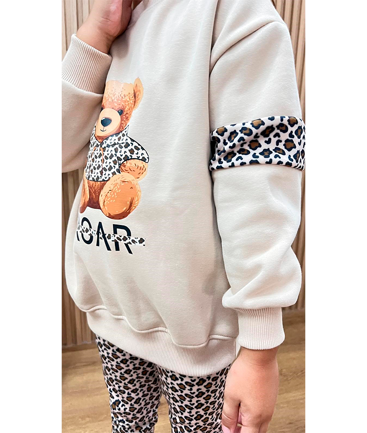 Conjunto niña de sudadera túnica color beige en felpa cardada con detalle manga tigresa y dtf oso en parte delantera y leggins en felpa con licra cardada sublimada tigresa.