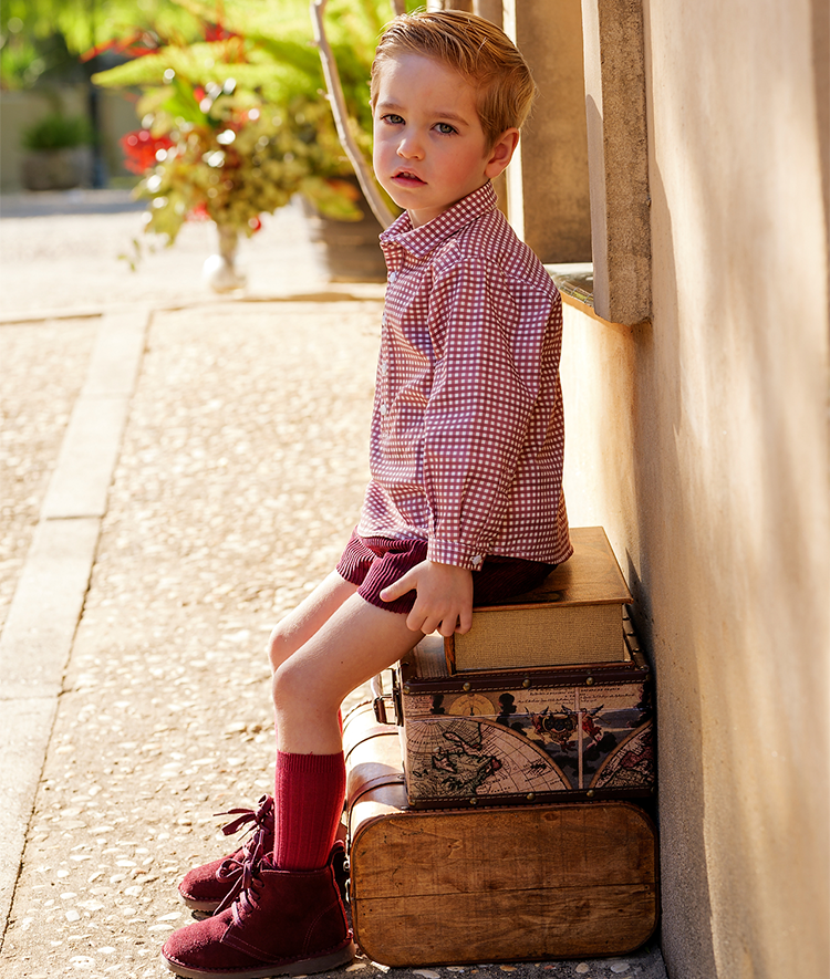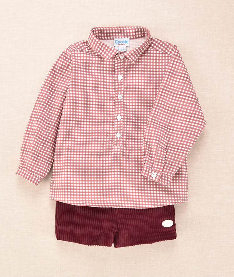 Conjunto niño dos piezas de camisa de manga larga y pantalón corto de pana, familia Toile de Jouy