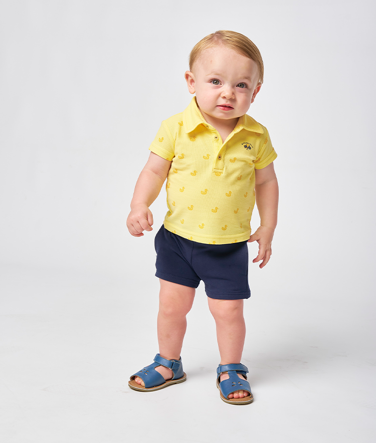 Set niño de polo amarilla de manga corta con bermuda azul marino.