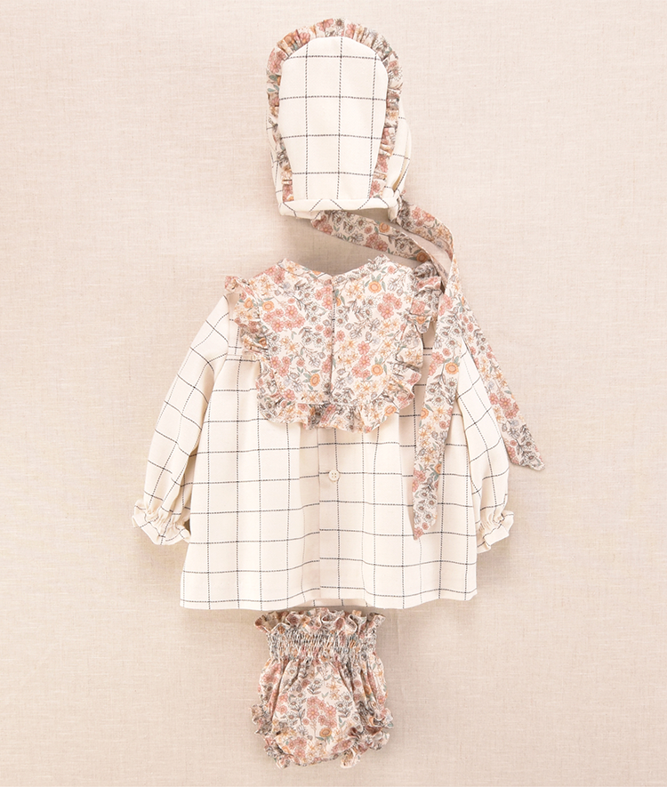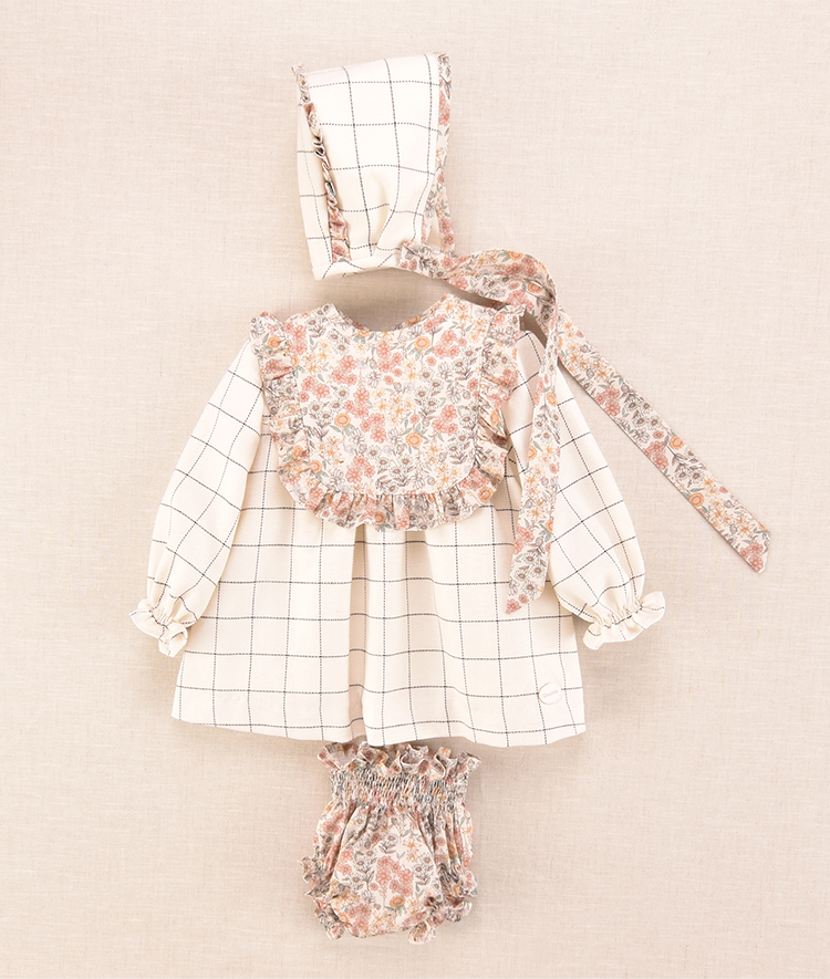 Vestido bebe niña de cuadros con braguita y capota a juego.