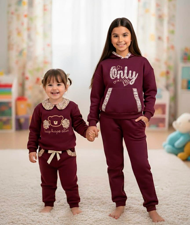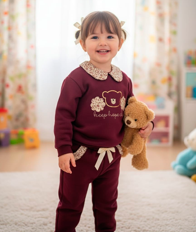 Conjunto bebe niña de sudadera en felpa cardada con cuello en tejido florido con brillos y bordado en contraste. Pantalón con puños en felpa cardada, cinta de lazo ajustable y bolsillos con volante en tejido de flores, color burdeos.