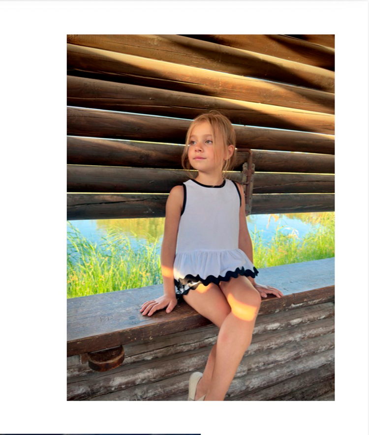 Conjunto niña de blusa blanca y pantalón corto vichy negro.