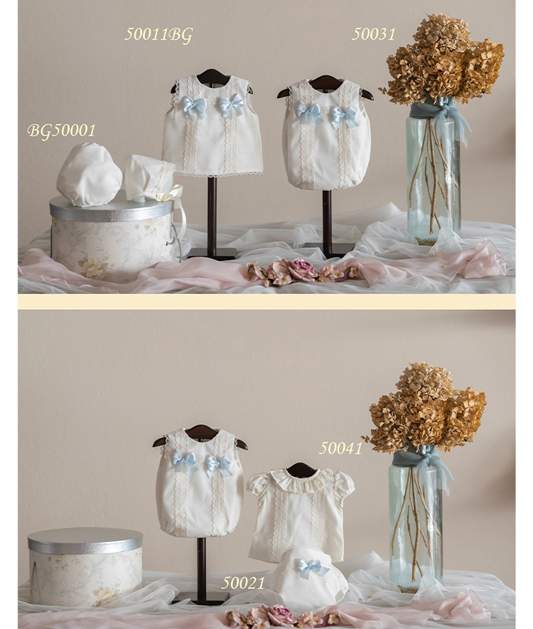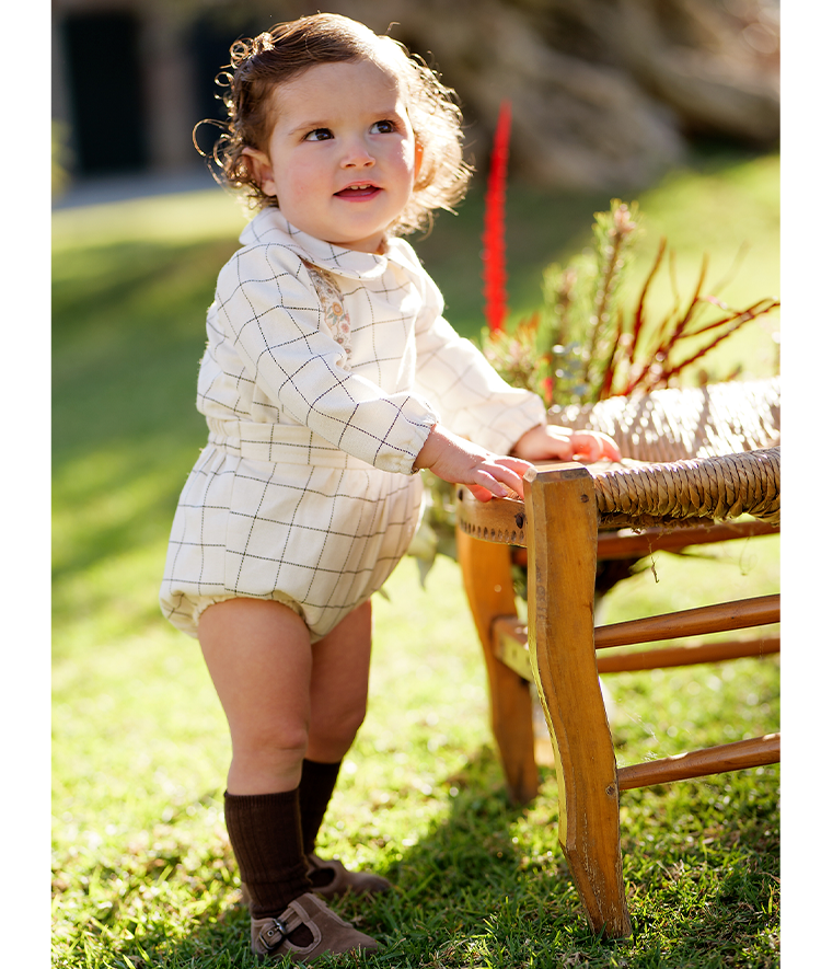 Pelele bebe semihilo beige con manga larga y lazos celeste.